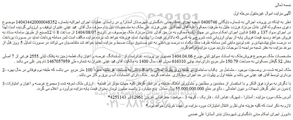 نظر به اینکه در پرونده اجرائی به شماره بایگانی 0400746 شعبه اجرای احکام مدنی دادگستری شهرستان آستارا و در راستای عملیات اجرای اجرائیه بشماره 140434420000048352 موضوع دعوی محکوم له آقای عادل مردزاد فرزند خلیل به طرفیت محکوم علیه آقای نجم الدین عینی فرزند علی،ملک به مشخصات ذیل بنام معرف مال آقای  محمد عینی عنبران توقیف و ارزیابی گردیده است لهذا در اجرای مواد 137 و 140 قانون اجرای احکام مدنی در جهت تادیه محکوم به در حق آقای عادل مردزاد ملک موصوف در تاریخ 1404/08/07 از ساعت 8 تا 12صبح از طریق سامانه ستاد به فروش خواهد رسید قیمت فروش پایه از بهای ارزیابی شده شروع و به کسی که بالاترین قیمت را پیشنهاد نماید فروخته خواهد شد برنده مزایده مکلف است ثمن معامله پرداخت نماید در صورت پرداخت ده درصد مبلغ پیشنهادی و عدم تودیع مابقی ثمن معامله ظرف مدت یکماه ده درصد پرداختی به نفع صندوق دولت ضبط و مزایده تجدید خواهد شد متقاضیان می توانند در صورت تمایل 5 روز قبل از موعد مزایده به دفتر شعبه مراجعه تا موجبات بازدید مورد مزایده فراهم گردد.
