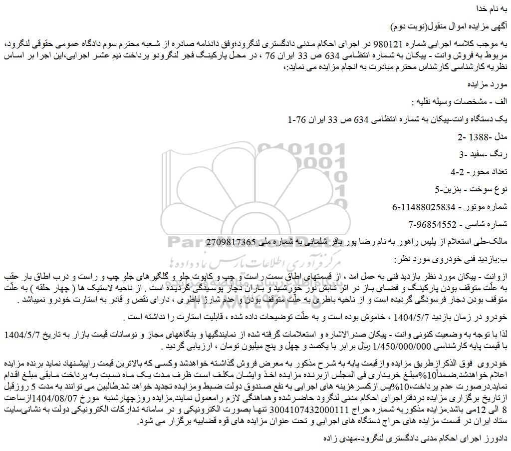 به موجب کلاسه اجرایی شماره 980121 در اجرای احکام مدنی دادگستری لنگرود؛وفق دادنامه صادره از شعبه محترم سوم دادگاه عمومی حقوقی لنگرود، مربوط به فروش وانت - پیکان به شماره انتظامی 634 ص 33 ایران 76 ، در محل پارکینگ فجر لنگرودو پرداخت نیم عشر اجرایی،این اجرا بر اساس نظریه کارشناسی کارشناس محترم مبادرت به انجام مزایده می نماید:،