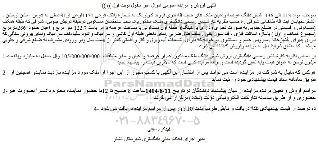 بموجب مواد 113 الی 136 شش دانگ عرصه واعیان ملک آقای حبیب اله ندری فرزند کبوتربگ به شماره پلاک فرعی 1151فرعی از91اصلی به آدرس: استان لرستان -الشتر-خیابان آیت اله طالقانی شرقی ره حسب نظریه کارشناس رسمی دادگستری ملک مذکوریک باب ساختمان مسکونی دوطبقه دونبش جنوبی، شرقی که طبقه همکف (مسکونی و قسمتی در ضلع جنوبی به صورت تجاری ودارای پارکینگ)و طبقه اول مسکونی با مساحت عرصه برابر باسند 122.7 متر مربع و اعیان حدودا 286مترمربع (مجموع همکف و اول ) باسازه اسکلت فلزی ، فنداسیون بتنی . سقف طاق ضربی .نمای داخلی طبقه اول کاشی و سرامیک واندود سفید،کف سرامیک ونمای بیرونی سنگی که دارای پذیرای ،آشپزخانه ،سرویس حمام و دستشوی.دو خوابه که دارای انشعبات آب وبرق و گاز و قدمتی کمتر از بیست سال ودر ورودی مشرف به ضلع شرقی و جنوبی میباشد. .که مطابق شرایط ذیل به مزایده وفروش گذاشته می شوند