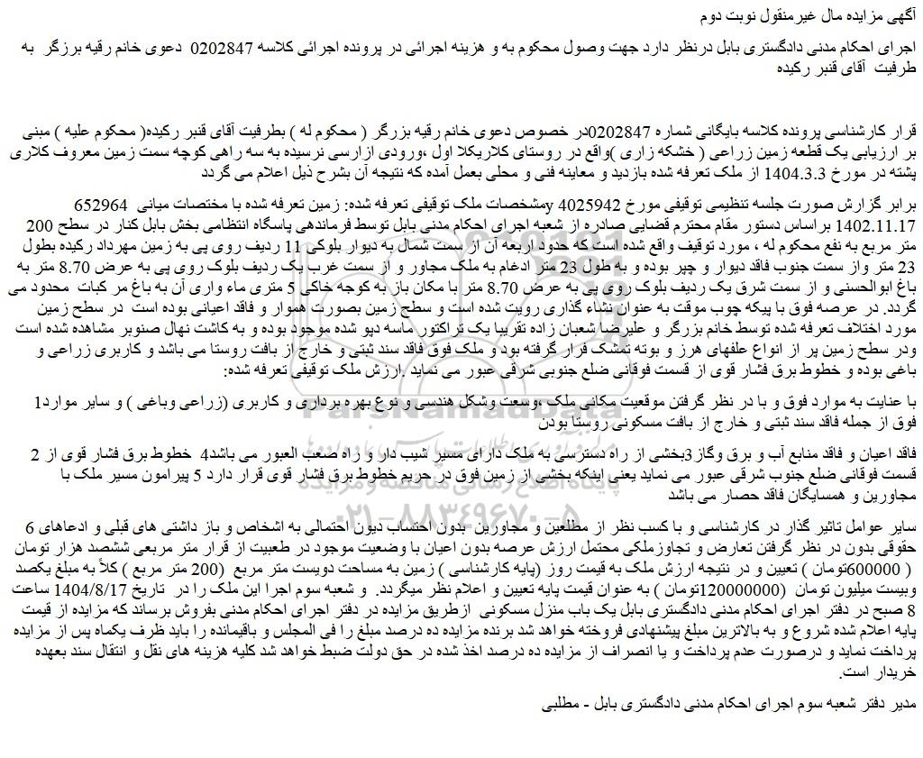 6 سایر عوامل تاثیر گذار در کارشناسی و با کسب نظر از مطلعین و مجاورین  بدون احتساب دیون احتمالی به اشخاص و باز داشتی های قبلی و ادعاهای حقوقی بدون در نظر گرفتن تعارض و تجاوزملکی محتمل ارزش عرصه بدون اعیان با وضعیت موجود در طعبیت از قرار متر مربعی ششصد هزار تومان  ( 600000تومان ) تعیین و در نتیجه ارزش ملک به قیمت روز (پایه کارشناسی ) زمین به مساحت دویست متر مربع  (200 متر مربع ) کلاً به مبلغ یکصد وبیست میلیون تومان  (120000000تومان ) به عنوان قیمت پایه تعیین و اعلام نظر میگردد.  و شعبه سوم اجرا این ملک را در  تاریخ 1404/8/17 ساعت 8 صبح در دفتر اجرای احکام مدنی دادگستری بابل یک باب منزل مسکونی  ازطریق مزایده در دفتر اجرای احکام مدنی بفروش برساند که مزایده از قیمت پایه اعلام شده شروع و به بالاترین مبلغ پیشنهادی فروخته خواهد شد برنده مزایده ده درصد مبلغ را فی المجلس و باقیمانده را باید ظرف یکماه پس از مزایده پرداخت نماید و درصورت عدم پرداخت و یا انصراف از مزایده ده درصد اخذ شده در حق دولت ضبط خواهد شد کلیه هزینه های نقل و انتقال سند بعهده خریدار است.
