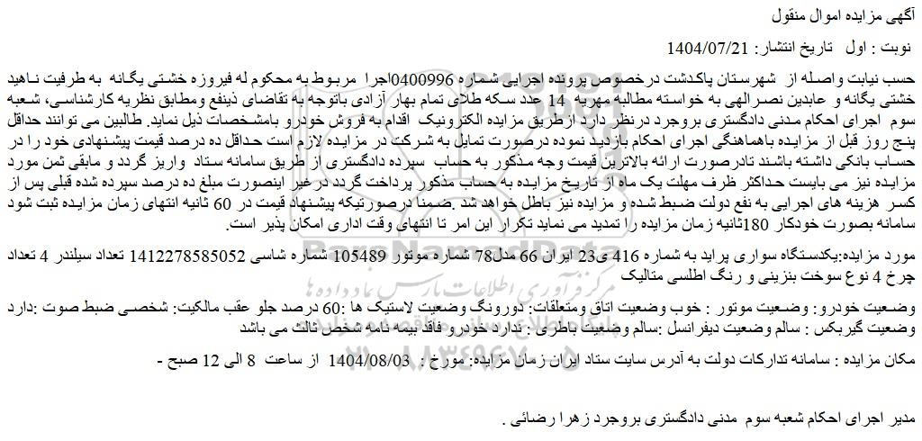 حسب نیابت واصله از  شهرستان پاکدشت درخصوص پرونده اجرایی شماره 0400996اجرا  مربوط به محکوم له فیروزه خشتی یگانه  به طرفیت ناهید خشتی یگانه و عابدین نصرالهی به خواسته مطالبه مهریه  14 عدد سکه طلای تمام بهار آزادی باتوجه به تقاضای ذینفع ومطابق نظریه کارشناسی، شعبه سوم  اجرای احکام مدنی دادگستری بروجرد درنظر دارد ازطریق مزایده الکترونیک  اقدام به فروش خودرو بامشخصات ذیل نماید. طالبین می توانند حداقل پنج روز قبل از مزایده باهماهنگی اجرای احکام بازدید نموده درصورت تمایل به شرکت در مزایده لازم است حداقل ده درصد قیمت پیشنهادی خود را در حساب بانکی داشته باشند تادرصورت ارائه بالاترین قیمت وجه مذکور به حساب  سپرده دادگستری از طریق سامانه ستاد  واریز گردد و مابقی ثمن مورد مزایده نیز می بایست حداکثر ظرف مهلت یک ماه از تاریخ مزایده به حساب مذکور پرداخت گردد درغیر اینصورت مبلغ ده درصد سپرده شده قبلی پس از کسر هزینه های اجرایی به نفع دولت ضبط شده و مزایده نیز باطل خواهد شد .ضمنا درصورتیکه پیشنهاد قیمت در 60 ثانیه انتهای زمان مزایده ثبت شود سامانه بصورت خودکار 180ثانیه زمان مزایده را تمدید می نماید تکرار این امر تا انتهای وقت اداری امکان پذیر است.