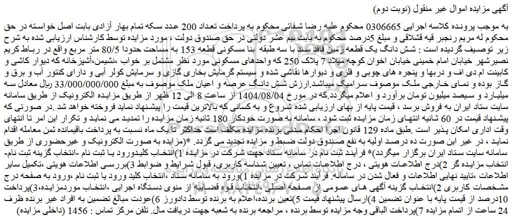 به موجب پرونده کلاسه اجرایی 0306665 محکوم علیه رضا شفائی محکوم به پرداخت تعداد 200 عدد سکه تمام بهار آزادی بابت اصل خواسته در حق محکوم له مریم رنجبر قیه قشلاقی و مبلغ 5درصد محکوم به بابت نیم عشر دولتی در حق صندوق دولت ، مورد مزایده توسط کارشناس ارزیابی شده به شرح زیر توصیف گردیده است : شش دانگ یک قطعه زمین فاقد سند با سه طبقه  بنا مسکونی قطعه 153 به مساحت حدودا 80/5 متر مربع واقع در رباط کریم نصیرشهر خیابان امام خمینی خیابان اخوان کوچه میلاد 7 پلاک 250 که واحدهای مسکونی مورد نظر مشتمل بر خواب ،نشیمن،آشپزخانه که دیوار کاشی و کابینت ام دی اف و دربها و پنجره های چوبی و فلزی و دیوارها نقاشی شده و سیستم گرمایش بخاری گازی و سرمایش کولر آبی و دارای کنتور آب و برق و گاز بوده و نمای خارجی ملک موصوف سرامیک میباشد.ارزش شش دانگ عرصه و اعیان ملک موصوف به مبلغ 33/000/000/000 ریال معادل سه میلیارد و سیصد میلیون تومان برآورد و اعلام میگردد.که در مورخ 1404/08/04 از ساعت 8 الی 12 ظهر از طریق مزایده الکترونیک از طریق سامانه سایت ستاد ایران به فروش برسد ، قیمت پایه از بهای ارزیابی شده شروع و به کسانی که بالاترین قیمت را پیشنهاد نماید فروخته خواهد شد .در صورتی که پیشنهاد قیمت در 60 ثانیه انتهای زمان مزایده ثبت شود ، سامانه به صورت خودکار 180 ثانیه زمان مزایده را تمدید می نماید و تکرار این امر تا انتهای وقت اداری امکان پذیر است .طبق ماده 129 قانون اجرا احکام مدنی برنده مزایده مکلف است حداکثر تا یک ماه نسبت به پرداخت باقیمانده ثمن معامله اقدام نماید ، در غیر این صورت ده درصد اولیه به نفع صندوق دولت ضبط و مزایده تجدید می گردد. *(مزایده به صورت الکترونیک و غیرحضوری از طریق سامانه سایت ستاد ایران برگزار میگردد)* فرآیند ثبت نام در سامانه ستاد جهت شرکت در مزایده 1)انتخاب کلیدورود یا ثبت نام -انتخاب گزینه ثبت نام-انتخاب مزایده گر 2)درج اطلاعات هویتی ، درج اطلاعات تماس ، تعیین شناسه کاربری، قبول شرایط و ضوابط 3)بررسی اطلاعات هویتی ،تکمیل سایر اطلاعات ،تایید نهایی اطلاعات و فعال شدن در سامانه. فرآیند شرکت در مزایده 1)ورود به سامانه ستاد ،انتخاب کلید ورود یا ثبت نام ،ورود به صفحه درج مشخصات کاربری 2)انتخاب گزینه آگهی های عمومی از صفحه اصلی ،انتخاب قوه قضاییه از منوی دستگاه اجرایی ،انتخاب موردمزایده،3)پرداخت 10درصد از قیمت پایه با عنوان تضمین 4)ارسال پیشنهاد قیمت 5)تعین برنده،اعلام به برنده توسط دادورز 6)عودت مبالغ تضمین به افراد غیر برنده ظرف 24 ساعت از اتمام مزایده 7)پرداخت الباقی وجه مزایده توسط برنده ، مراجعه برنده به شعبه جهت دریافت مال. تلفن مرکز تماس : 1456 (داخلی مزایده)
