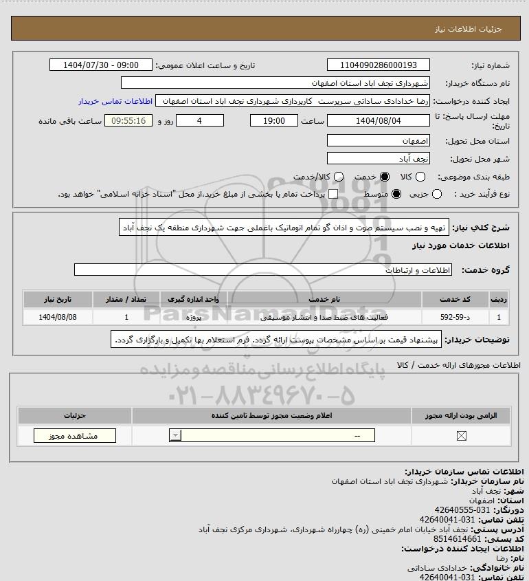 شرح کلی نیاز: تهیه و نصب سیستم صوت و اذان گو تمام اتوماتیک باغملی جهت شهرداری منطقه یک نجف آباد