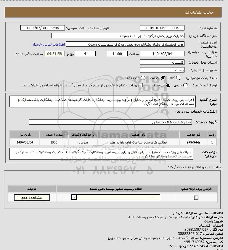 شرح کلی نیاز: اجرای بتن ریزی خیابان منبع آب برابر دتایل و برآورد پیوستی...پیمانکاارن دارای گواهینامه صلاحیت پیمانکاری باشد.مدارک و مستندات توسط پیمانکار امضا گردد