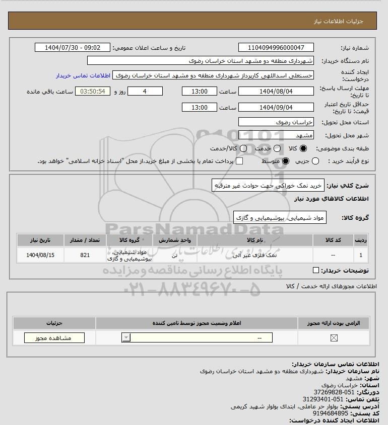 شرح کلی نیاز: خرید نمک خوراکی جهت حوادث غیر مترقبه