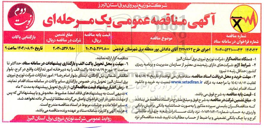 اجرای طرح 2760762 آقای داداش پور منطقه برق شهرستان فردیس | 20.305.369.800 | 2.030.536.980 | تاریخ 1404.8.20 ساعت 9 |