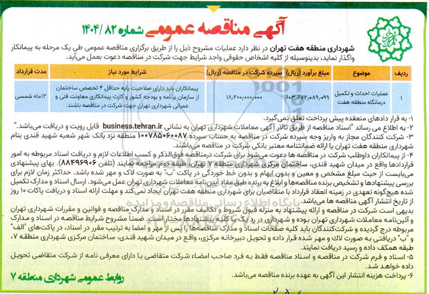 1 عملیات احداث و تکمیل درمانگاه منطقه هفت  603.672.089.099  18.200.000.000  پیمانکاران باید دارای صلاحیت پایه حداقل 4 تخصص ساختمان از سازمان برنامه و بودجه کشور و کارت پیمانکاری معاونت فنی و عمرانی شهرداری تهران جهت شرکت در مناقصه باشند 12 ماه شمسی