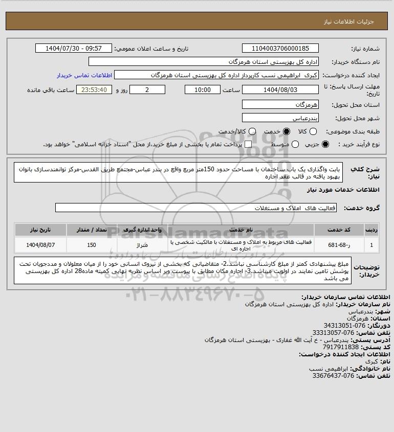 شرح کلی نیاز: بابت واگذاری یک باب ساختمان با مساحت حدود 150متر مربع واقع در بندر عباس-مجتمع طریق القدس-مرکز توانمندسازی بانوان بهبود یافته در قالب عقد اجاره