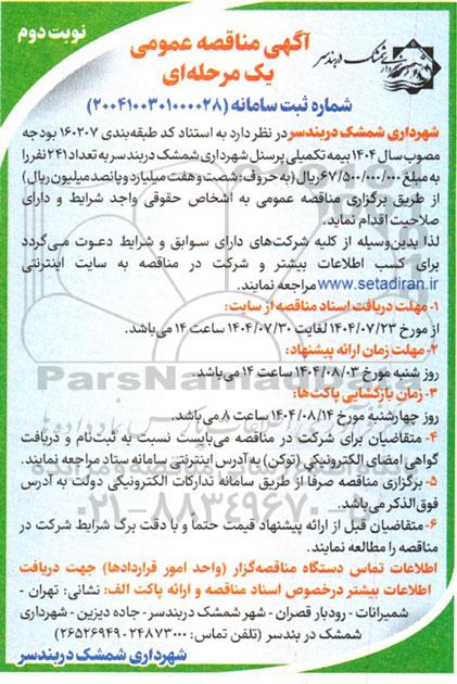 شهرداری شمشک دربندسر در نظر دارد به استناد که طبقه بندی 160207 بودجه مصوب سال 1404 بیمه تکمیلی پرسنل شهرداری شمشک دربند سر به تعداد 241 نفر را به مبلغ 67.500.000.000 ریال به حروف شصت و هفت میلیارد و پانصد میلیون ریال) از طریق برگزاری مناقصه عمومی به اشخاص حقوقی واجد شرایط و دارای صلاحیت اقدام نماید. لذا بدین وسیله از کلیه شرکتهای دارای سوابق و شرایط دعوت میگردد برای کسب اطلاعات بیشتر و شرکت در مناقصه به سایت اینترنتی ستاد ایران مراجعه نمایند .