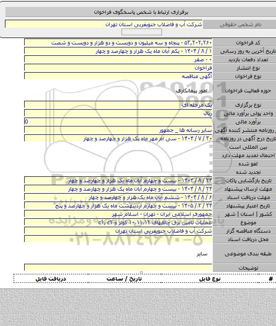 مناقصه عملیات تامین برق چاههای ۱۰۱۱۱۲ کوثر و c۱ c۲ از کلیه افراد متخصص و شرکتها واجد شرایط دعوت به عمل میآید در مناقصه با کد خبرگزاری پارس نماد: 9737214 شرکت نمایند.