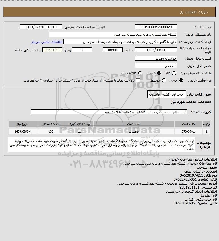 شرح کلی نیاز: اجرت لوله کشی فاضلاب