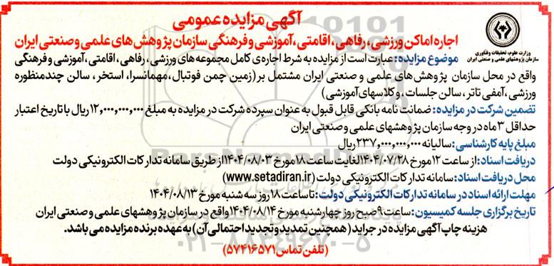 وزارت علوم، تحقیقات و فناوری سازمان پژوهشهای علمی و صنعتی ایران موضوع مزایده عبارت است از مزایده به شرط اجاره ی کامل مجموعه های ورزشی، رفاهی، اقامتی، آموزشی و فرهنگی واقع در محل سازمان پژوهشهای علمی و صنعتی ایران مشتمل بر (زمین چمن فوتبال، مهمانسرا، استخر، سالن چند منظوره ورزشی آمفی تئاتر ، سالن جلسات ، و کلاسهای آموزشی)