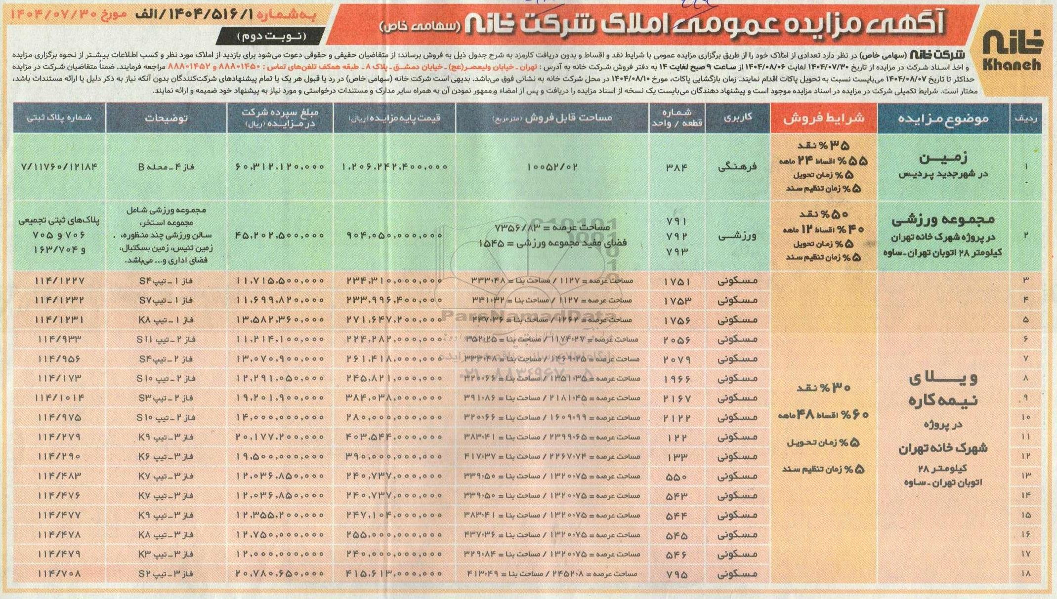 شرکت خانه (سهامی خاص) در نظر دارد تعدادی از املاک خود را از طریق برگزاری مزایده عمومی با شرایط نقد و اقساط و بدون دریافت کارمزد به شرح جدول ذیل به فروش برساند از متقاضیان حقیقی و حقوقی دعوت می شود برای بازدید از تبلاک مورد نظر و کسب اطلاعات بیشتر از نحوه برگزاری مزایده و اخذ استاد شرکت در مزایده از تاریخ 1404.07.30 لغایت 1404.08.06 از ساعت 9 صبح لغایت 14 به دفتر فروش شرکت خانه به آدرس ایران ، خیابان ولیعصر تدين حال مستی ، پلاک طبقه همکف تلفن های تماعی : 88801450 و 88801452 مراجعه فرمایند. ضمناً متقاضیان شرکت در مزایده حداکثر تا تاریخ 1404.08.07 می بایست نسبت به تحویل پاکات اقدام نمایند. زمان بازگشایی پاکات مورخ 1404.08.10 در محل شرکت خانه به نشانی فوق می باشد. بدیهی است شرکت خته (سهامی خاص) در رد یا قبول هر یک با تمام پیشنهادهای شرکت کنندگان بدون آنکه نیاز به ذکر دلیل با ارائه مستندات باشد. مختار است. شرایط تکمیلی شرکت در مزایده در استاد مزایده موجود است و پیشنهاد دهندگان می بایست یک نسخه از اسناد مزایده را دریافت و پس از امضاء و ممهور سودن آن به همراه سایر مدارک و مستندات درخواستی و مورد نیاز به پیشنهاد خود ضمیمه و ارائه نمایند.