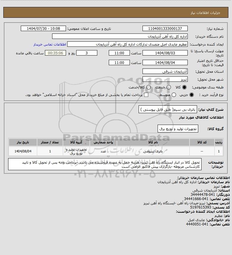 1 -- باتری لیتیومی عدد تجهیزات تولید و توزیع برق 1 1404/08/04