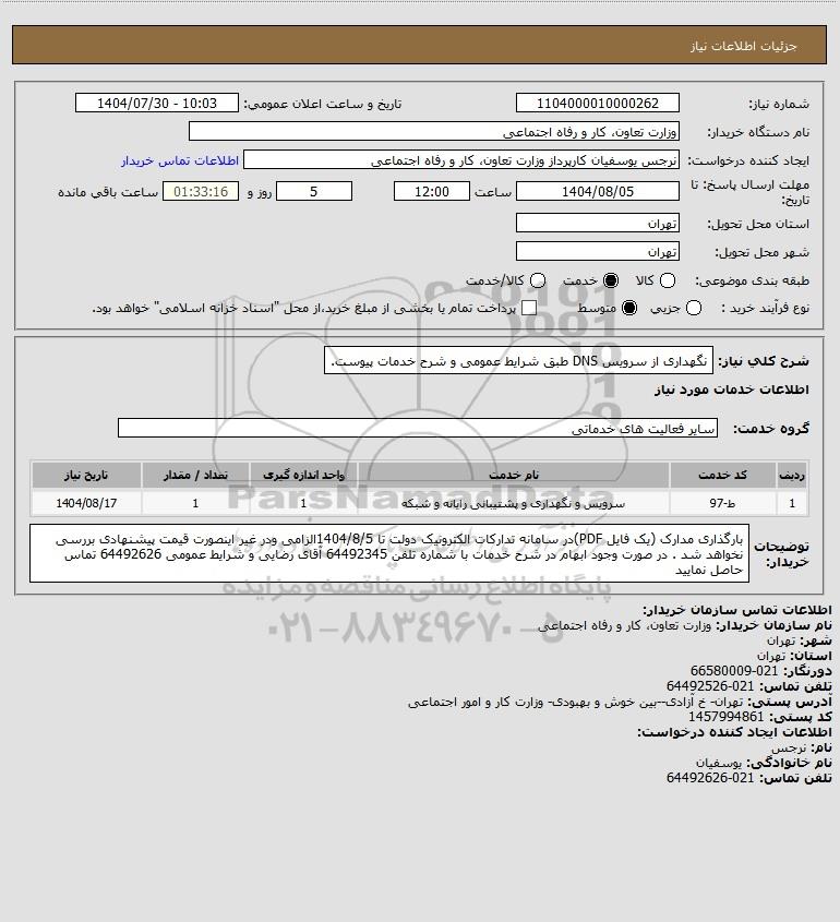 شرح کلی نیاز: نگهداری از سرویس DNS طبق شرایط عمومی و شرح خدمات پیوست.