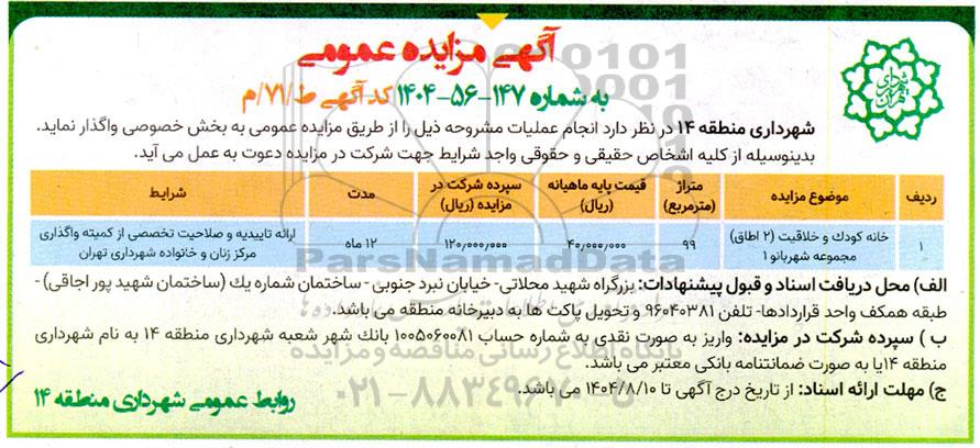 | خانه کودک و خلاقیت (2 اتاق) مجموعه شهربانو 1 | 99 | 40.000.000 | 120.000.000 | 12 ماه | ارائه تاییدیه و صلاحیت تخصصی از کمیته واگذاری مرکز زنان و خانواده شهرداری تهران |