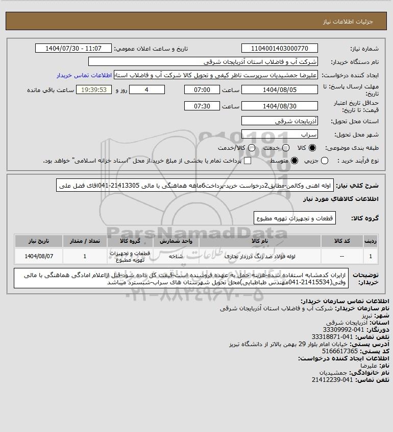نام دستگاه خریدار:شرکت آب و فاضلاب استان آذربایجان شرقی
