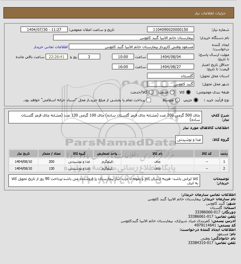 شرح کلی نیاز: چای 500 گرمی 200 عدد (مشابه چای قرمز گلستان ساده)