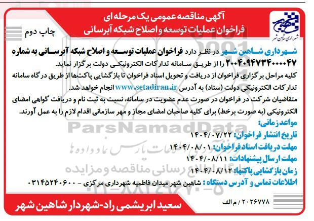 شهرداری شاهین شهر در نظر دارد فراخوان عملیات توسعه و اصلاح شبکه آبرسانی به شماره 2004094734000047 را از طریق سامانه تدارکات الکترونیکی دولت برگزار نماید.