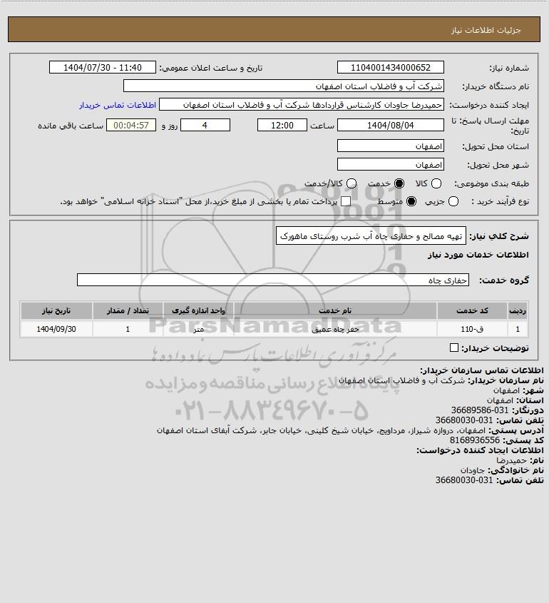 شرح کلی نیاز: تهیه مصالح و حفاری چاه آب شرب روستای ماهورک