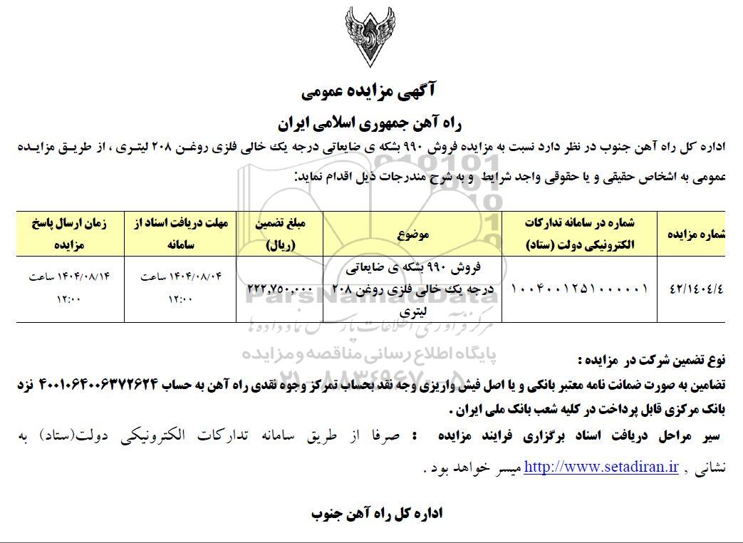 اداره کل راه آهن جنوب در نظر دارد نسبت به مزایده فروش 990 بشکه ضایعاتی درجه یک خالی فلزی روغن 208 لیتری از طریق مزایده عمومی به اشخاص حقیقی یا حقوقی واجد شرایط و به شرح مندرجات ذیل اقدام نماید: