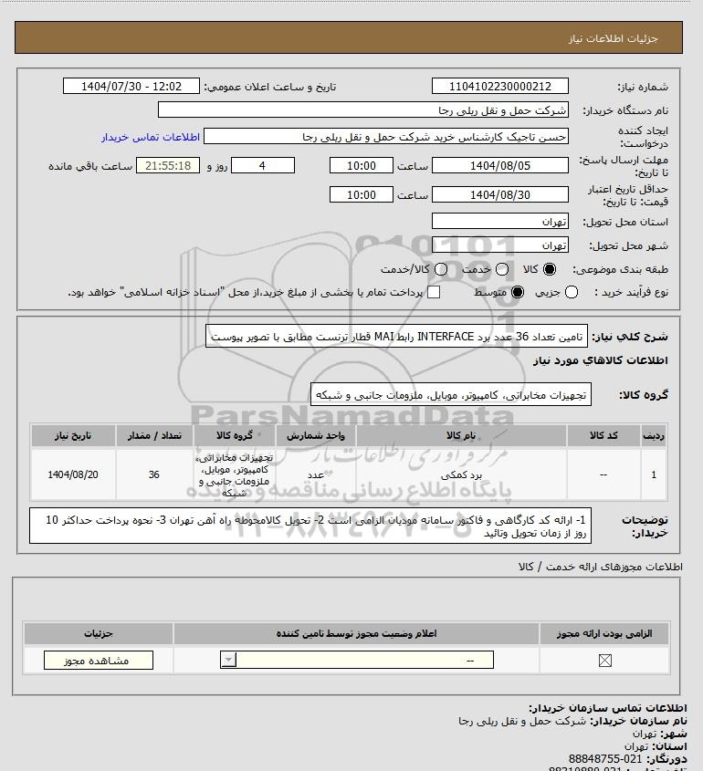 | 1 | -- | برد کمکی | عدد | تجهیزات مخابراتی، کامپیوتر، موبایل، ملزومات جانبی و شبکه | 36 | 1404/08/20 |
