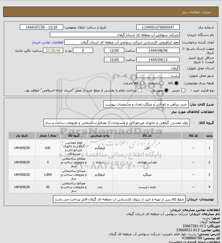 شرح کلی نیاز: خرید تیرآهن و ناودانی و میلگرد.تعداد و مشخصات پیوست