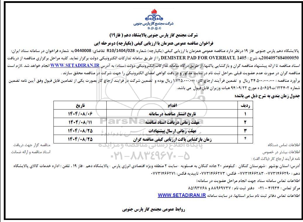 پالایشگاه دهم پارس جنوبی فاز 19 در نظر دارد مناقصه عمومی همزمان با ارزیابی کیفی (یکپارچه) شماره R10/1404/028 تقاضای 0440008 به شماره فراخوان در سامانه ستاد ایران : 2004097684000050 به شرح : 1405 DEMISTER PAD FOR OVERHAUL را از طریق سامانه تدارکات الکترونیکی دولت برگزار نماید. کلیه مراحل برگزاری مناقصه از دریافت اسناد مناقصه تا ارائه پیشنهاد مناقصه گران و بازگشایی پاکتها، از طریق درگاه سامانه تدارکات الکترونیکی دولت (ستاد) به آدرس ستاد ایران انجام خواهد شد  لازم است. مناقصه گران در صورت عدم عضویت قبلی مراحل ثبت نام در سایت مذکور و دریافت گواهی امضای الکترونیکی را جهت شرکت در مناقصه محقق سازند .