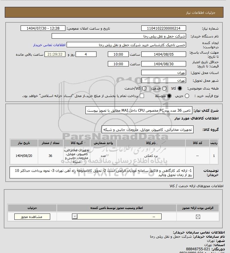 | 1 | -- | برد کمکی | عدد | تجهیزات مخابراتی، کامپیوتر، موبایل، ملزومات جانبی و شبکه | 36 | 1404/08/20 |