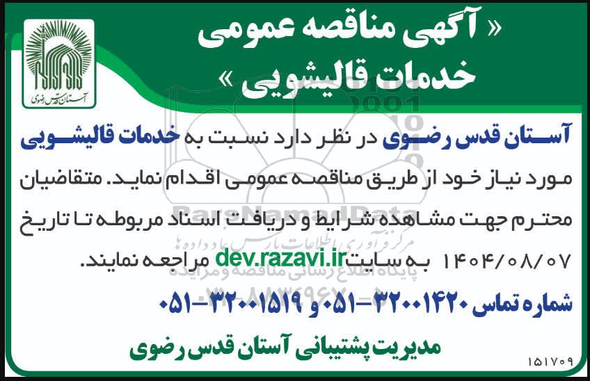 آستان قدس رضوی در نظر دارد نسبت به خدمات قالیشویی مورد نیاز خود از طریق مناقصه عمومی اقدام نماید. متقاضیان محترم جهت مشاهده شرایط و دریافت اسناد مربوطه تا تاریخ 1404.08.07 به سایت dev.razavi.ir مراجعه نمایند.