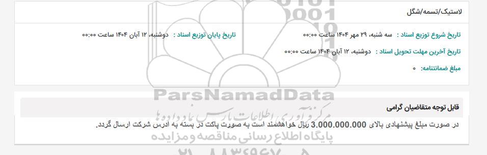 استعلام لاستیک/ تسمه / شگل -مناقصه روز چهارشنبه سی ام مهر ماه 1404 از کلیه افراد متخصص و شرکتها واجد شرایط دعوت به عمل میآید در مناقصه با کد خبرگزاری پارس نماد: 9738607 شرکت نمایند.