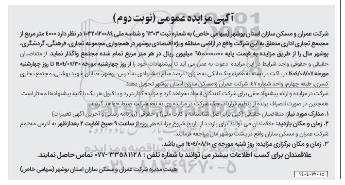 شرکت عمران و مسکن سازان استان بوشهر (سهامی خاص) به شماره ثبت 6303 و شناسه ملی 10320120084 در نظر دارد 4000 متر مربع از مجتمع تجاری اداری متعلق به این شرکت واقع در اراضی منطقه ویژه اقتصادی بوشهر در همجواری مجموعه تجاری ، فرهنگی ، گردشگری ، بوشهر مال را از طریق مزایده به قیمت پایه 650.000.000 میلیون ریال در هر متر مربع تمام شده مجتمع واگذار نماید. از متقاضیان حقیقی و حقوقی واجد شرایط در این مزایده دعوت به عمل می آید تا پیشنهادات خود را از روز چهارشنبه مورخه 1404.7.30 تا روز چهارشنبه مورخه ی 1404.8.7 در پاکت دربسته به همراه چک بانکی به میزان 1 درصد مبلغ پیشنهادی به آدرس بوشهر خیابان شهید دکتر بهشتی مجتمع تجاری کسری طبقه چهارم واحد شماره 47 شرکت عمران و مسکن سازان استان بوشهر تحویل دهند.
