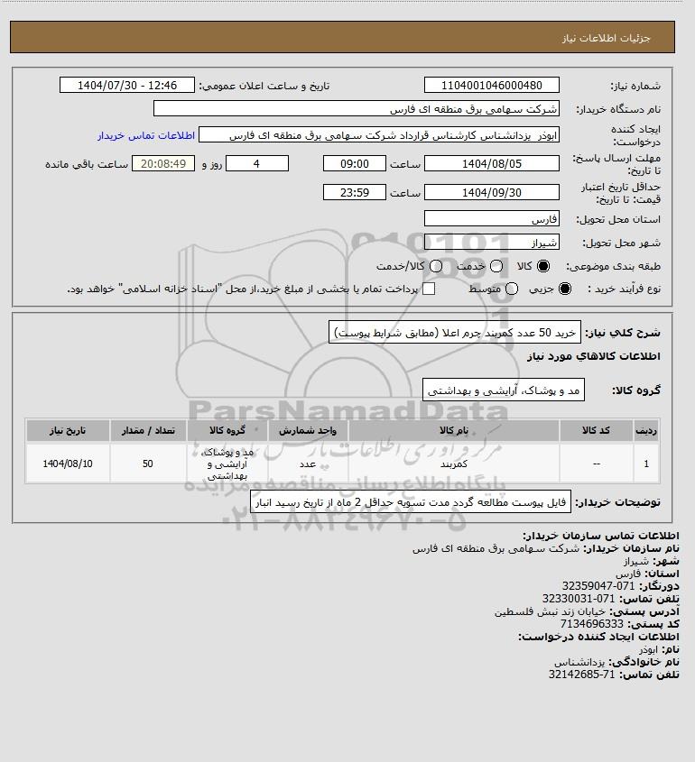 نام سازمان خریدار: شرکت سهامی برق منطقه ای فارس