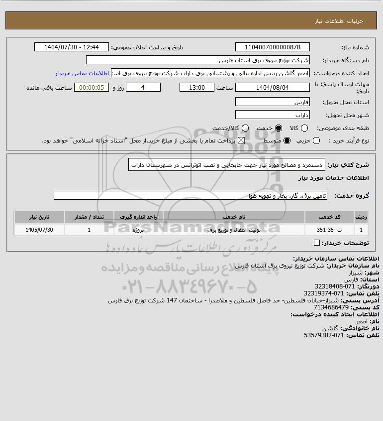 استعلام دستمزد و مصالح مورد نیاز جهت جابجایی و نصب اتوترانس در شهرستان داراب, استعلام دستمزد و مصالح مورد نیاز جهت جابجایی و نصب اتوترانس در شهرستان داراب