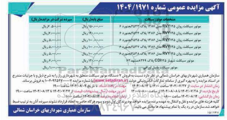سازمان همیاری شهرداری های خراسان شمالی در نظر دارد نسبت به فروش 7 دستگاه موتورسیکلت متعلق به شهرداری راز را به شرح ذیل و با جزئیات مندرج در اسناد مزایده را به بهره گیری از سامانه تدارکات الکترونیکی دولت (ستاد ایران) با شماره مزایده 1004092547000007 به فروش برساند.