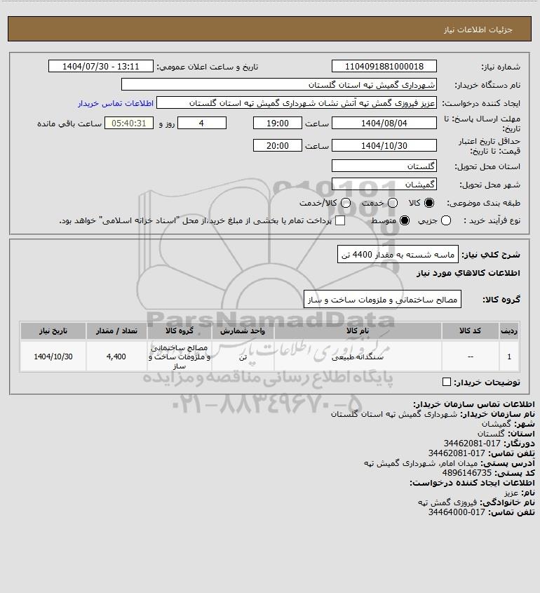 شرح کلی نیاز: ماسه شسته به مقدار 4400 تن