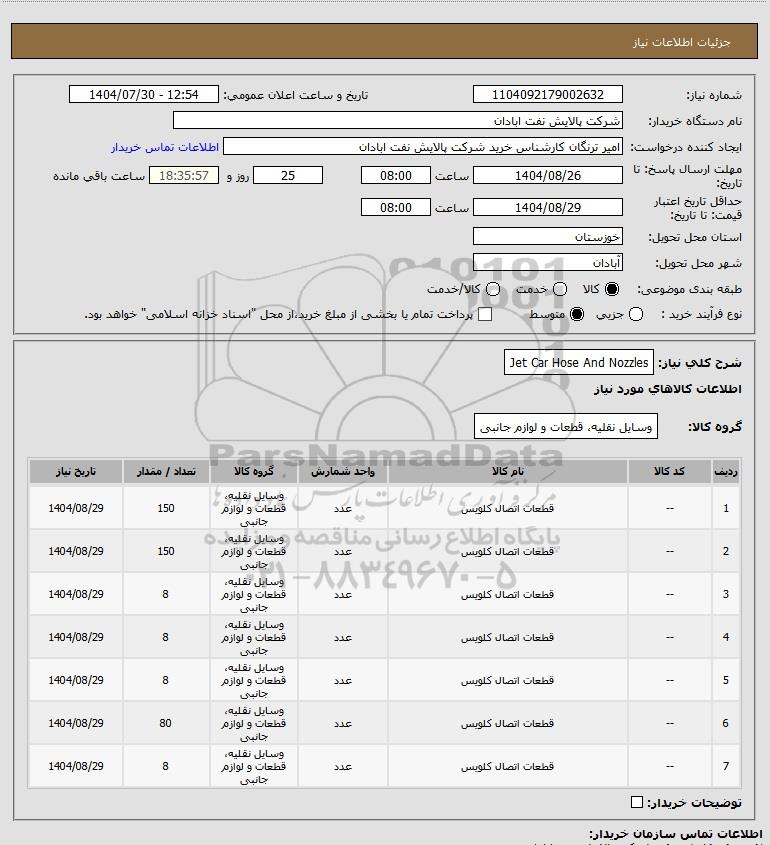 | 5 | -- | قطعات اتصال کلویس | عدد | وسایل نقلیه، قطعات و لوازم جانبی | 8 | 1404/08/29 |