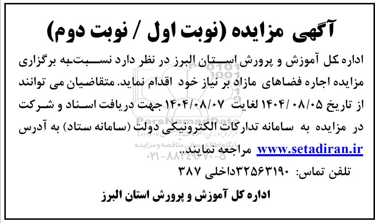 اداره کل آموزش و پرورش استان البرز در نظر دارد نسبت به برگزاری مزایده اجاره فضاهای مازاد بر نیاز خود اقدام نماید. متقاضیان می توانند از تاریخ 1404.08.05 لغایت 1404.08.07 جهت دریافت اسناد و شرکت در مزایده به سامانه تدارکات الکترونیکی دولت (سامانه ستاد) به آدرس ستاد ایران مراجعه نمایند.