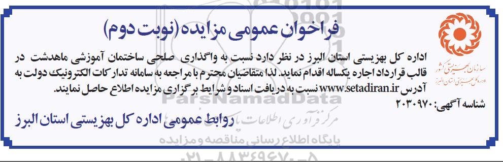 اداره کل بهزیستی استان البرز در نظر دارد نسبت به واگذاری صلحی ساختمان آموزشی ماهدشت در قالب قرارداد اجاره یکساله اقدام نماید . لذا متقاضیان محترم با مراجعه به سامانه تدارکات الکترونیک دولت به آدرس ستاد ایران نسبت به دریافت اسناد و شرایط برگزاری مزایده اطلاع حاصل نمایند.