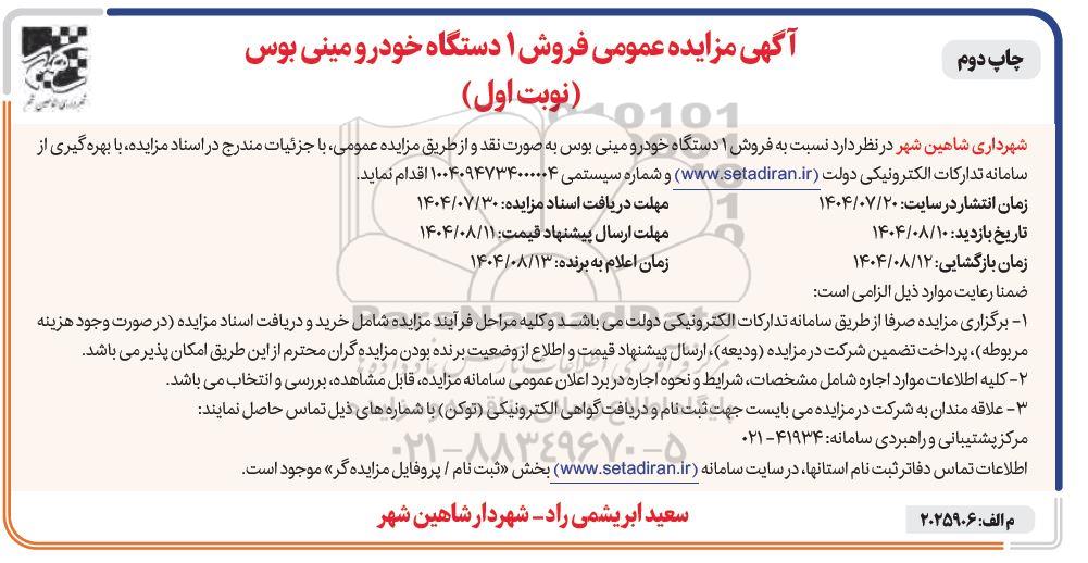 شهرداری شاهین شهر در نظر دارد نسبت به فروش 1 دستگاه خودرو مینی بوس به صورت نقد و از طریق مزایده عمومی با جزئیات مندرج در اسناد مزایده، با بهره گیری از سامانه تداركات الكترونیكی دولت (ستاد ایران) و شماره سیستمی 1004094734000004 اقدام نماید.