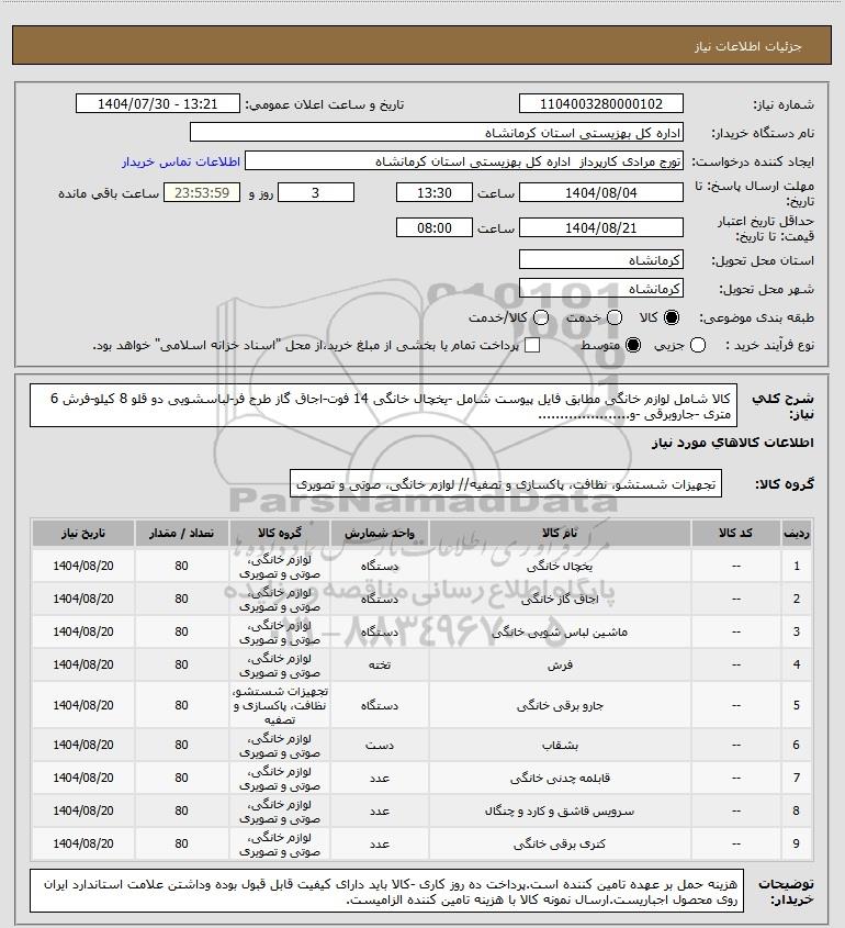 شرح کلی نیاز: کالا شامل لوازم خانگی مطابق فایل پیوست شامل -یخچال خانگی 14 فوت-اجاق گاز طرح فر-لباسشویی دو قلو 8 کیلو-فرش 6 متری -جاروبرقی -و.....................