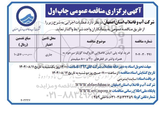 شرکت آب و فاضلاب استان اصفهان در نظر دارد عملیات اجرایی به شرح زیر را از طریق مناقصه عمومی به پیمانکاران واجد شرایط واگذار نماید.