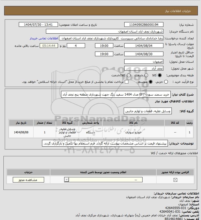 شرح کلی نیاز: خرید سمند سورن EF7 مدل 1404 سفید رنگ جهت شهرداری منطقه پنج نجف آباد