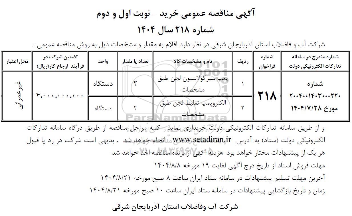 مناقصه عمومی خرید پمپ سیر کولاسیون لجن طبق مشخصات از کلیه افراد متخصص و شرکتها واجد شرایط دعوت به عمل میآید در مناقصه با کد خبرگزاری پارس نماد: 9739305 شرکت نمایند.