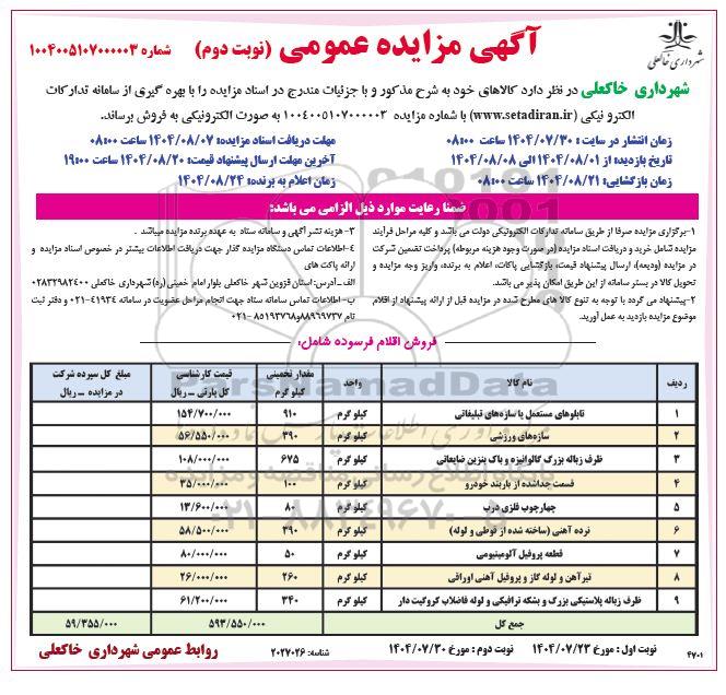 شهرداری خاکعلی در نظر دارد کالاهای خود به شرح مذکور و با جزئیات مندرج در اسناد مزایده را با بهره گیری از سامانه تدارکات الکترو نیکی ستاد ایران با شماره مزایده 1004005107000003 به صورت الکترونیکی به فروش برساند.