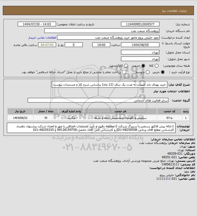 شرح کلی نیاز: خرید پهنای باند اینترنت به مدت یک سال (12 ماه) براساس شرح کار و مستندات پیوست