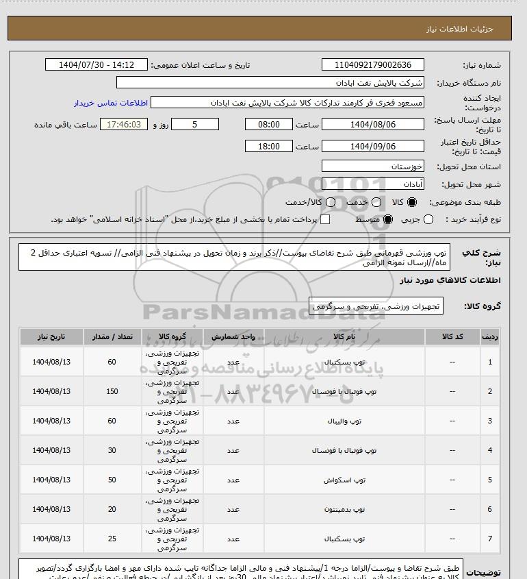 شرح کلی نیاز: توپ ورزشی قهرمانی طبق شرح تقاضای پیوست//ذکر برند و زمان تحویل در پیشنهاد فنی الزامی// تسویه اعتباری حداقل 2 ماه//ارسال نمونه الزامی