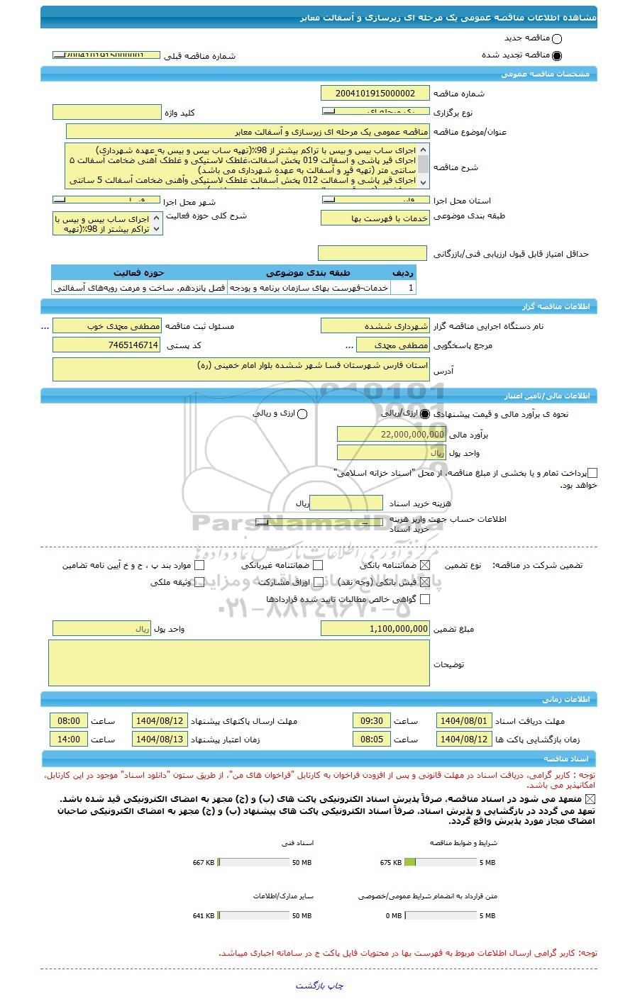 آخرین دریافت پیشنهادها و تاریخ بازگشایی پاکتها و اطلاعات دقیقتر درباره شرایط این مناقصه و نحوه ارسال مدارک، و الزامات پروژه در اطلاعات تکمیلی این آگهی مناقصه درج شده است. لطفا ثبت نام کنید تا اطلاعات کامل را ببینید. علاقهمندان میتوانند جهت دریافت اسناد و اطلاعات تکمیلی، مناقصه مناقصه عمومی یک مرحله ای زیرسازی و آسفالت معابر با سامانه مناقصات و مزایدات ایران پارسنماد داده ها 88349670 تماس حاصل نمایند.