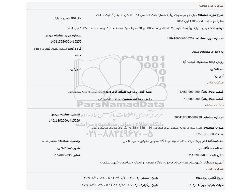 مزایده عمومی مزایده خودرو سواری روآ به شماره پلاک انتظامی 54 – 588 ج 38 به رنگ نوک مدادی متالیک و مدل ساخت 1385 تیپ ROA برگزار میگردد. از کلیه افراد متخصص و شرکتهای واجد شرایط دعوت به عمل میآید تا در این مزایده با کد خبرگزاری پارس نماد : 9739566 شرکت نمایند تاریخ شروع مزایده : 1404/07/30 مهلت شرکت در مزایده: تا پایان روز 1404/08/15