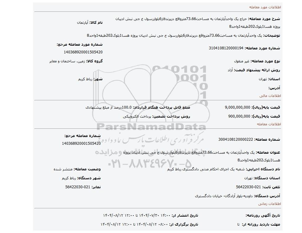 | شرح مورد معامله: حراج یک واحدآپارتمان به مساحت73.66مترواقع درپرندفاز6بلواررسول خ جی نبش ادیبان پروژه هسا1بلوک202طبقه1واحد8 | نام کالا: آپارتمان | |